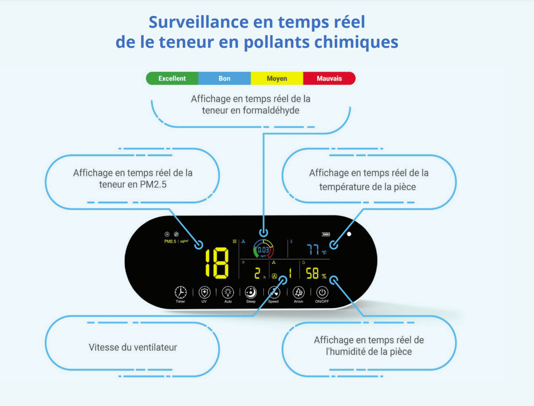 Il monitor AIRVIA ti avvisa quando la qualità dell’aria diventa preoccupante, consentendoti di intervenire rapidamente per purificare il tuo ambiente. Il suo display chiaro e intuitivo ti fornisce tutte le informazioni necessarie per regolare la ventilazione o attivare il purificatore AIRVIA secondo necessità.